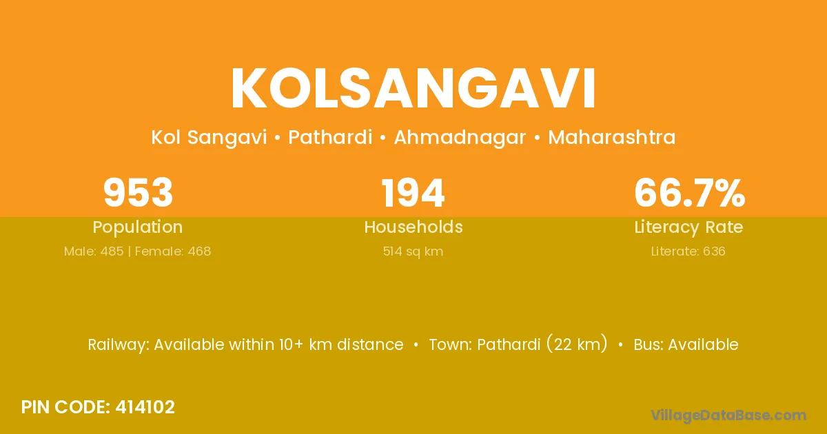 Pathardi (22 km) is the nearest town to Kolsangavi village for major economic activities and is located approximately 22 km away.