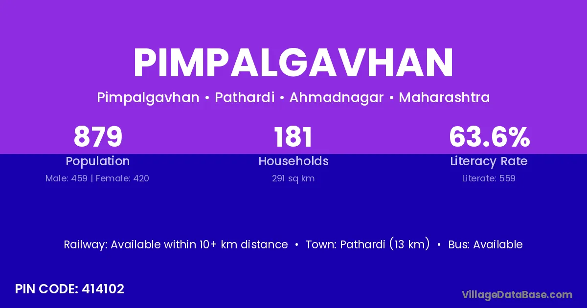 Pathardi (13 km) is the nearest town to Pimpalgavhan village for major economic activities and is located approximately 13 km away.