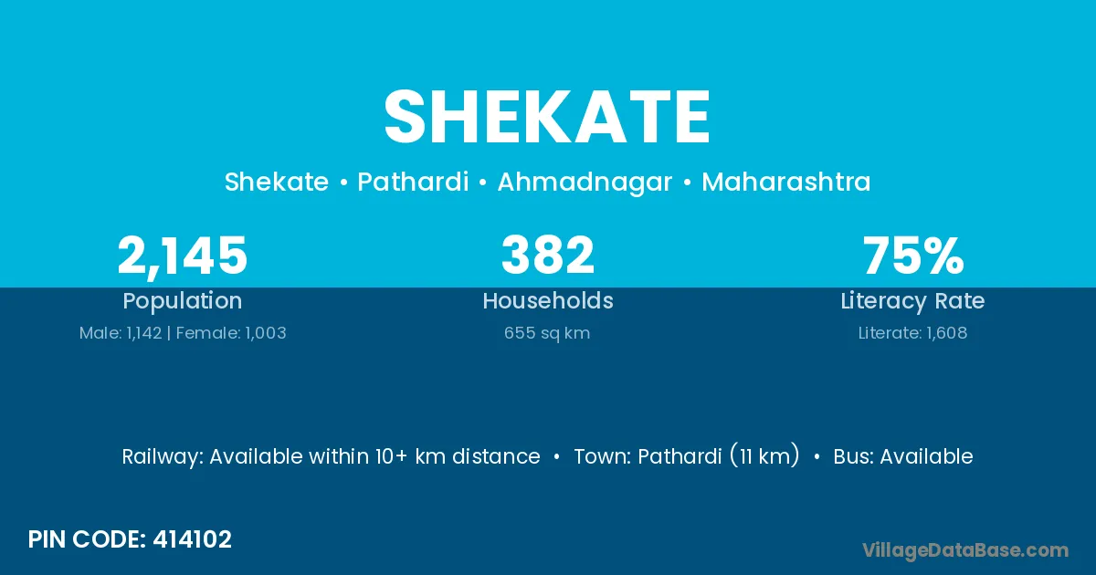 Pathardi (11 km) is the nearest town to Shekate village for major economic activities and is located approximately 11 km away.