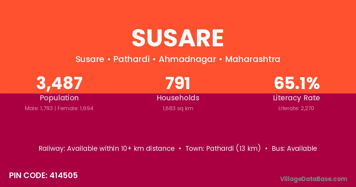 Pathardi (13 km) is the nearest town to Susare village for major economic activities and is located approximately 13 km away.
