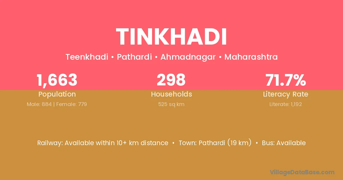 Pathardi (19 km) is the nearest town to Tinkhadi village for major economic activities and is located approximately 19 km away.