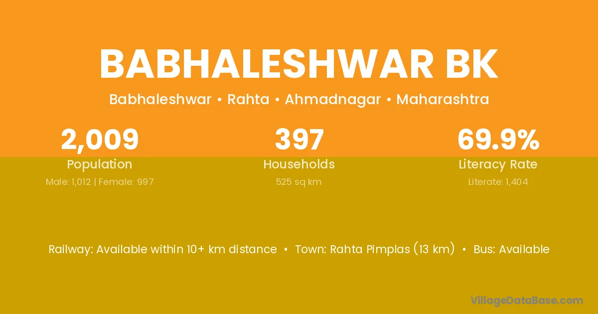 Babhaleshwar Bk village has a total population of 2,009 people, of which 1,012 are males and 997 are females.