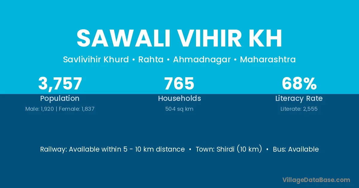 Shirdi (10 km) is the nearest town to Sawali Vihir Kh village for major economic activities and is located approximately 10 km away.