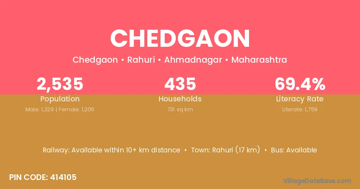 Rahuri (17 km) is the nearest town to Chedgaon village for major economic activities and is located approximately 17 km away.