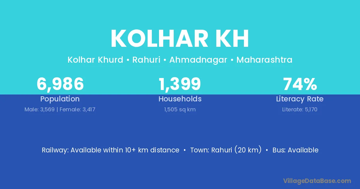 Rahuri (20 km) is the nearest town to Kolhar Kh village for major economic activities and is located approximately 20 km away.