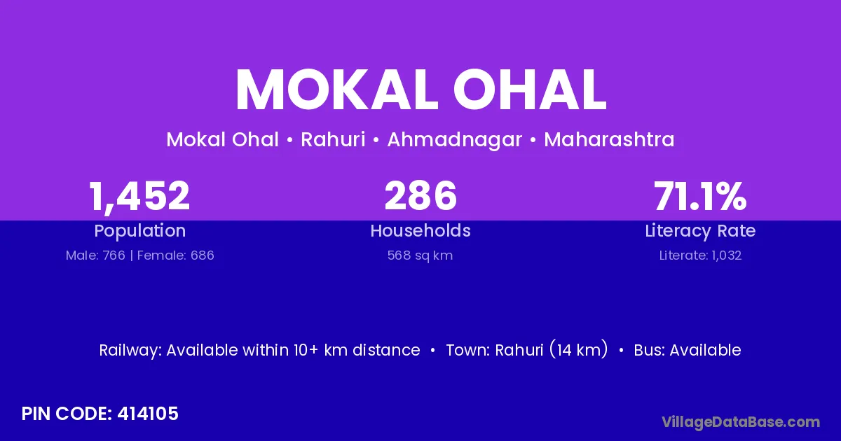 Rahuri (14 km) is the nearest town to Mokal Ohal village for major economic activities and is located approximately 14 km away.