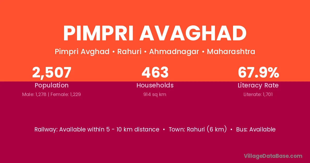 Rahuri (6 km) is the nearest town to Pimpri Avaghad village for major economic activities and is located approximately 6 km away.