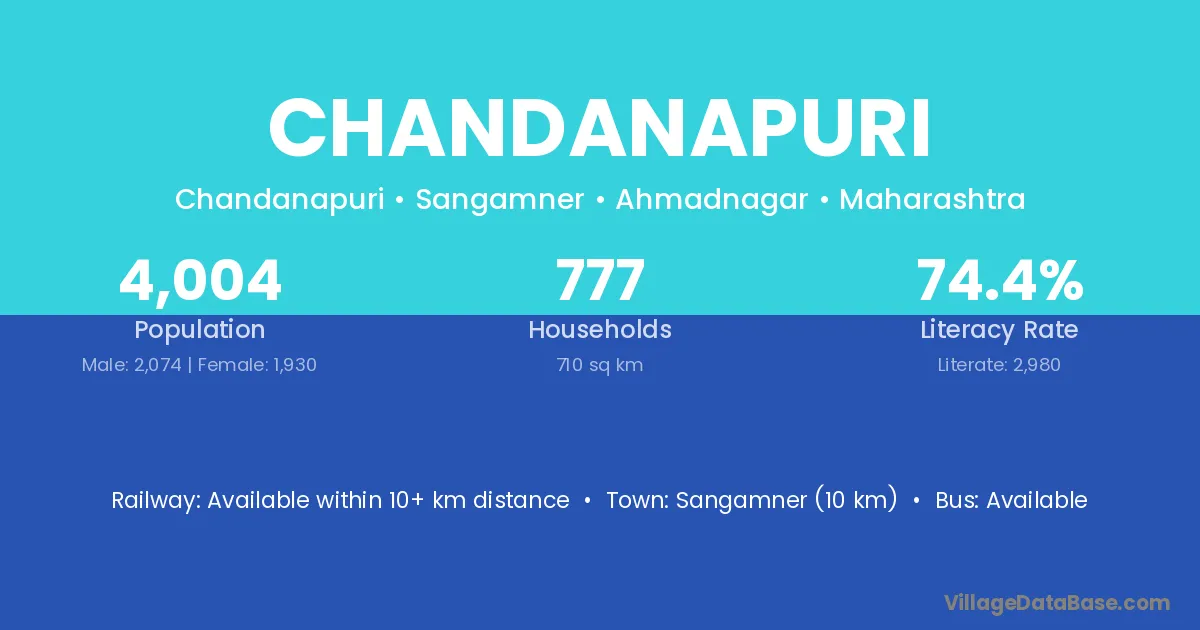 Sangamner (10 km) is the nearest town to Chandanapuri village for major economic activities and is located approximately 10 km away.