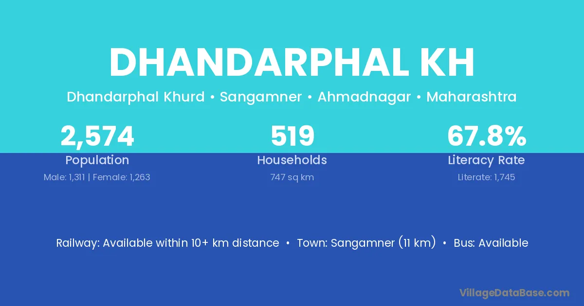 Sangamner (11 km) is the nearest town to Dhandarphal Kh village for major economic activities and is located approximately 11 km away.