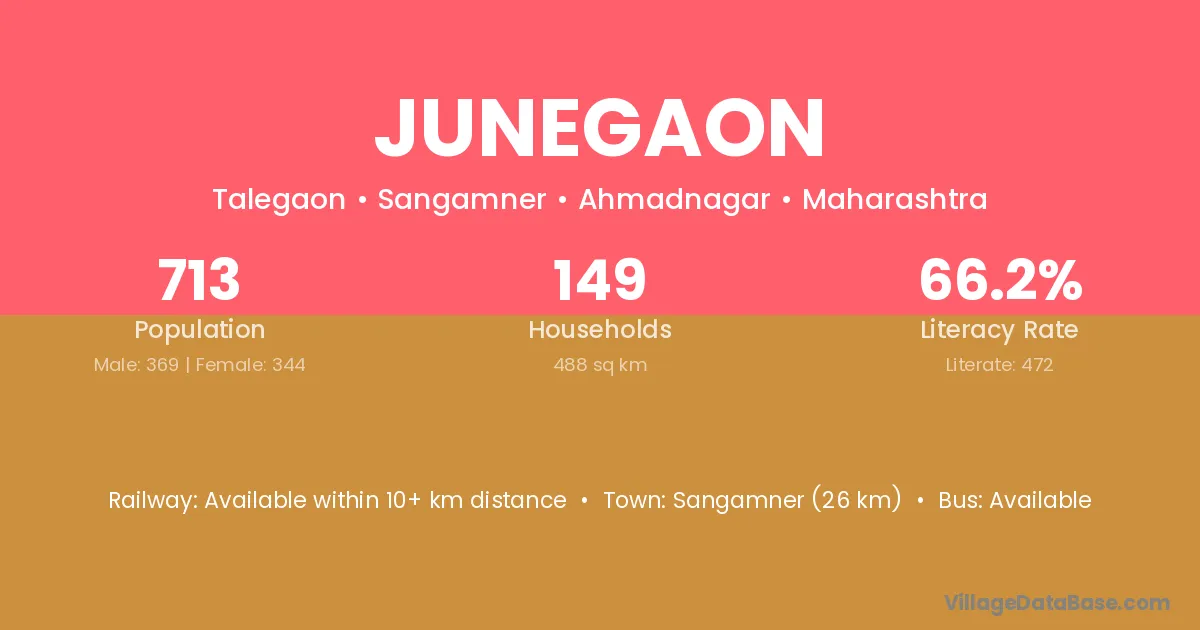 Sangamner (26 km) is the nearest town to Junegaon village for major economic activities and is located approximately 26 km away.