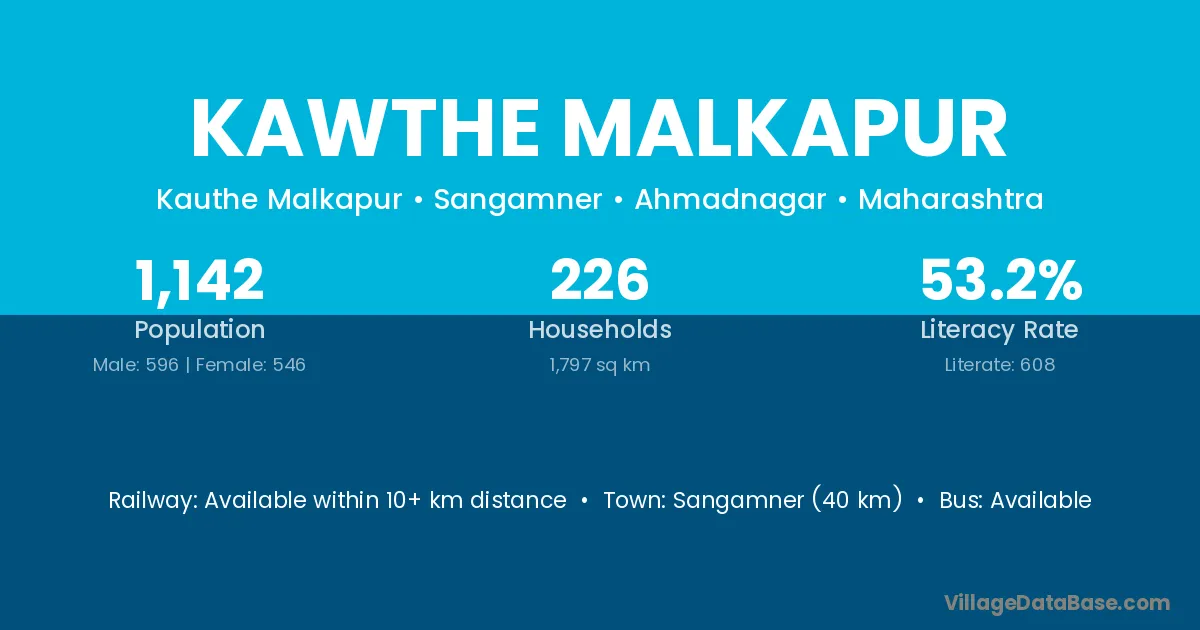 Sangamner (40 km) is the nearest town to Kawthe Malkapur village for major economic activities and is located approximately 40 km away.