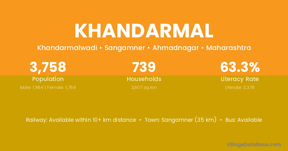 Sangamner (35 km) is the nearest town to Khandarmal village for major economic activities and is located approximately 35 km away.
