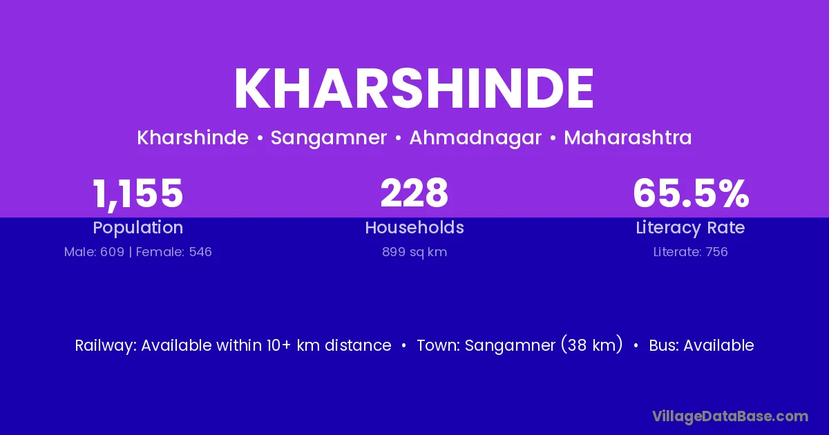 Sangamner (38 km) is the nearest town to Kharshinde village for major economic activities and is located approximately 38 km away.