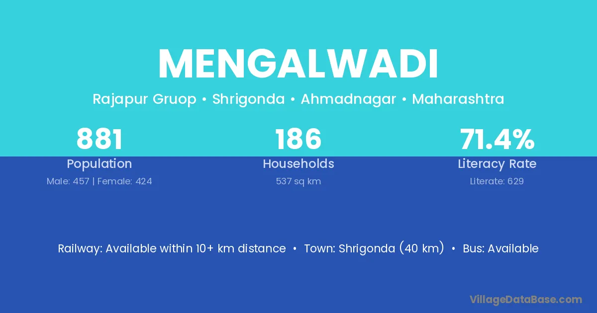 Sangamner (21 km) is the nearest town to Mengalwadi village for major economic activities and is located approximately 21 km away.