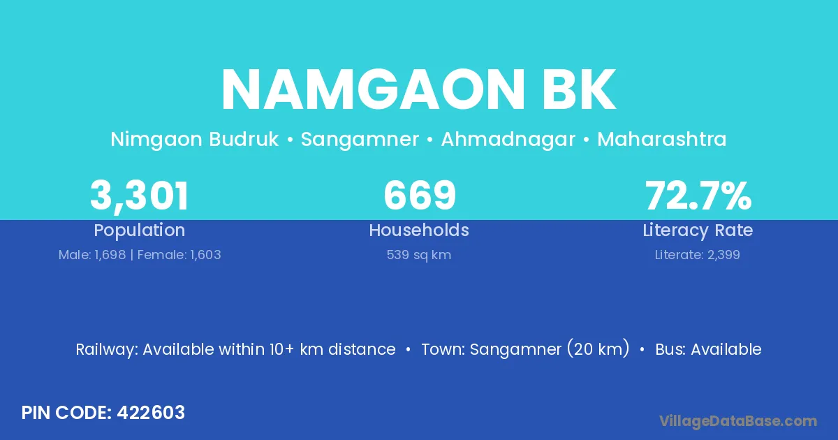 Sangamner (20 km) is the nearest town to Namgaon Bk village for major economic activities and is located approximately 20 km away.