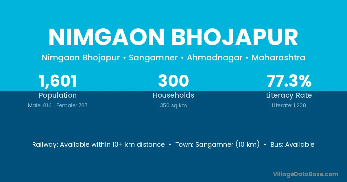 The literacy rate of Nimgaon Bhojapur village is 77.33%. Male literacy stands at 83.29% and female literacy at 71.16%.