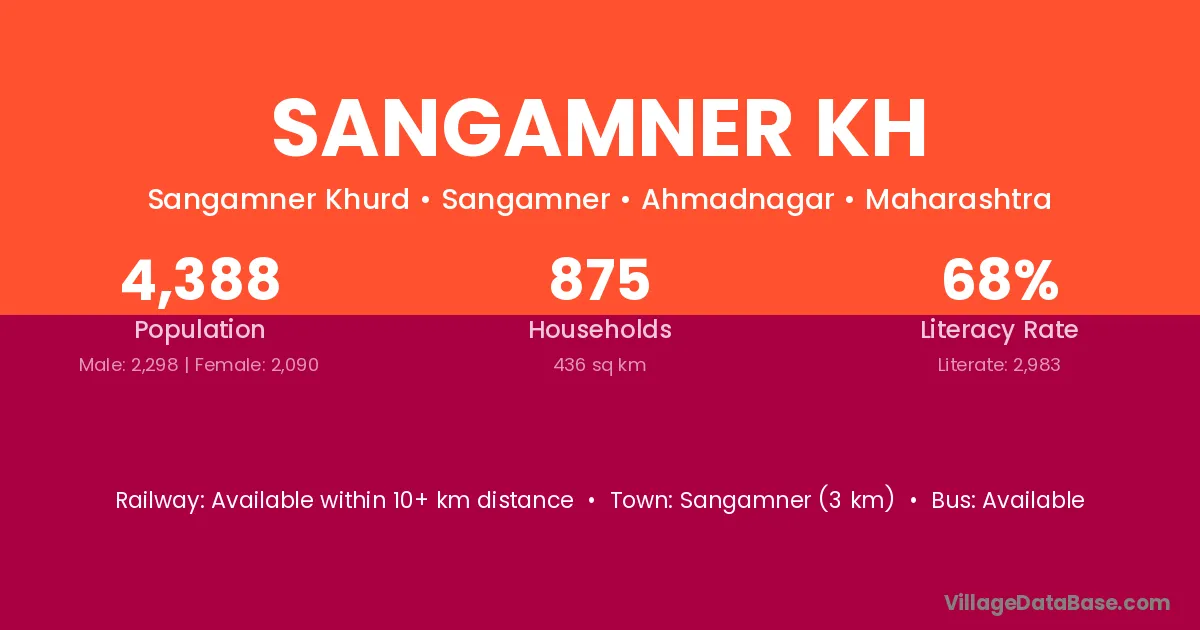 Sangamner Kh village has a total population of 4,388 people, of which 2,298 are males and 2,090 are females.