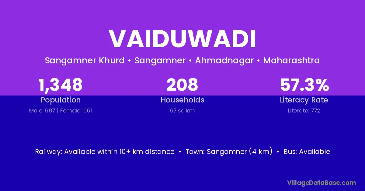 Sangamner (4 km) is the nearest town to Vaiduwadi village for major economic activities and is located approximately 4 km away.