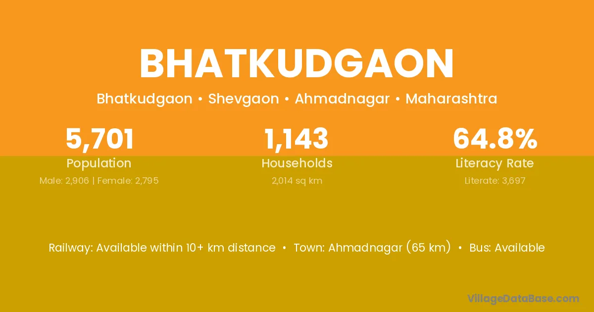Ahmadnagar (65 km) is the nearest town to Bhatkudgaon village for major economic activities and is located approximately 65 km away.