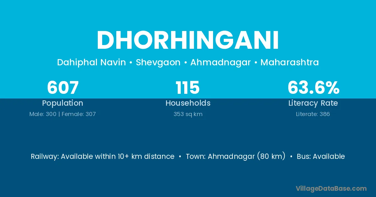 Ahmadnagar (80 km) is the nearest town to Dhorhingani village for major economic activities and is located approximately 80 km away.