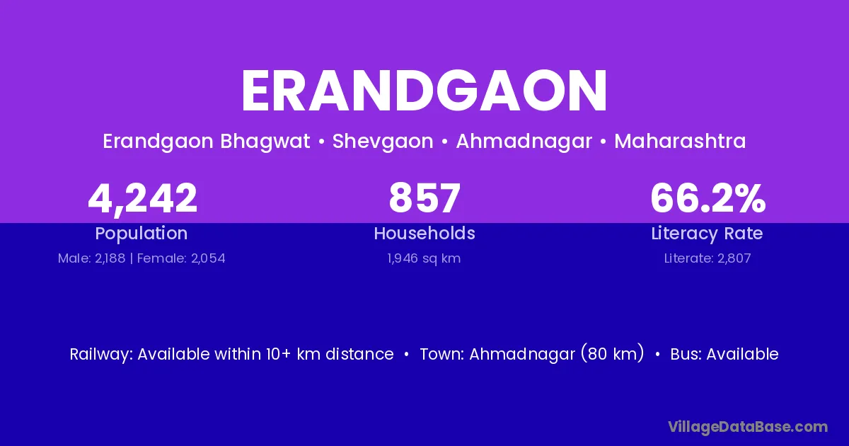 Ahmadnagar (80 km) is the nearest town to Erandgaon village for major economic activities and is located approximately 80 km away.