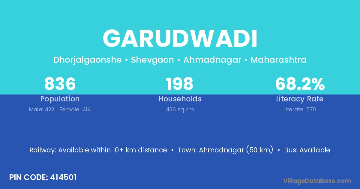 Ahmadnagar (50 km) is the nearest town to Garudwadi village for major economic activities and is located approximately 50 km away.