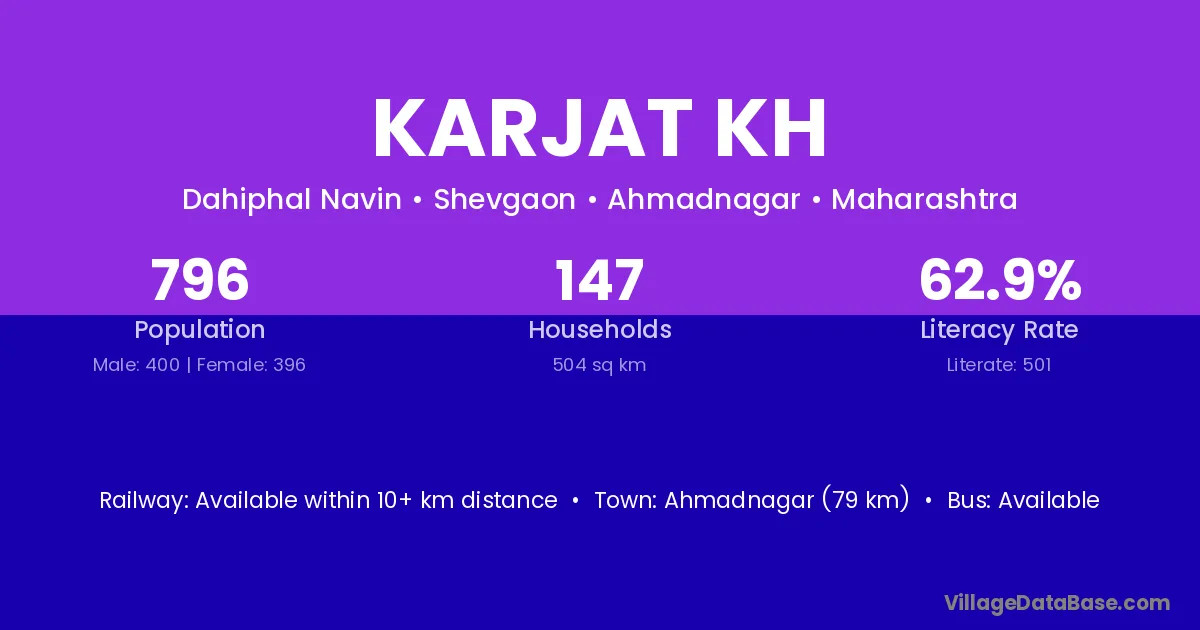 Ahmadnagar (79 km) is the nearest town to Karjat Kh village for major economic activities and is located approximately 79 km away.