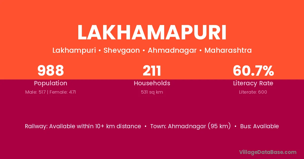 Ahmadnagar (95 km) is the nearest town to Lakhamapuri village for major economic activities and is located approximately 95 km away.