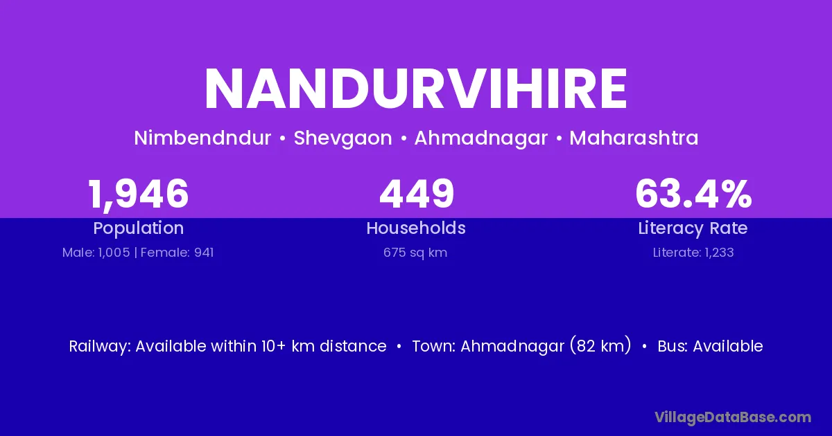 Ahmadnagar (82 km) is the nearest town to Nandurvihire village for major economic activities and is located approximately 82 km away.