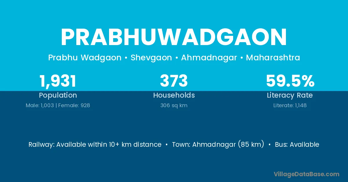 Ahmadnagar (85 km) is the nearest town to Prabhuwadgaon village for major economic activities and is located approximately 85 km away.