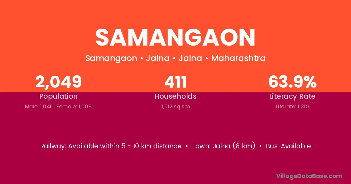 Samangaon village has a total population of 1,804 people, of which 912 are males and 892 are females.