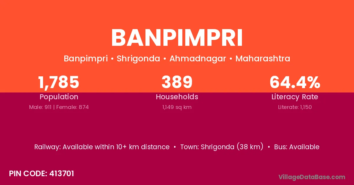 Shrigonda (38 km) is the nearest town to Banpimpri village for major economic activities and is located approximately 38 km away.