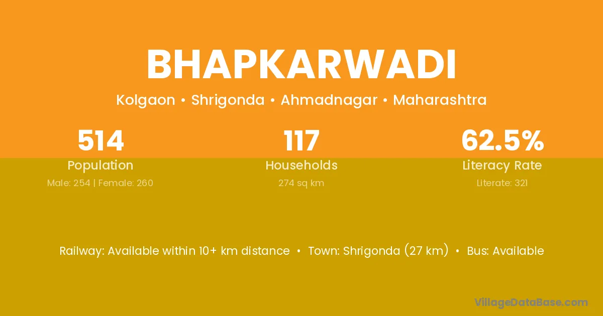 Shrigonda (27 km) is the nearest town to Bhapkarwadi village for major economic activities and is located approximately 27 km away.