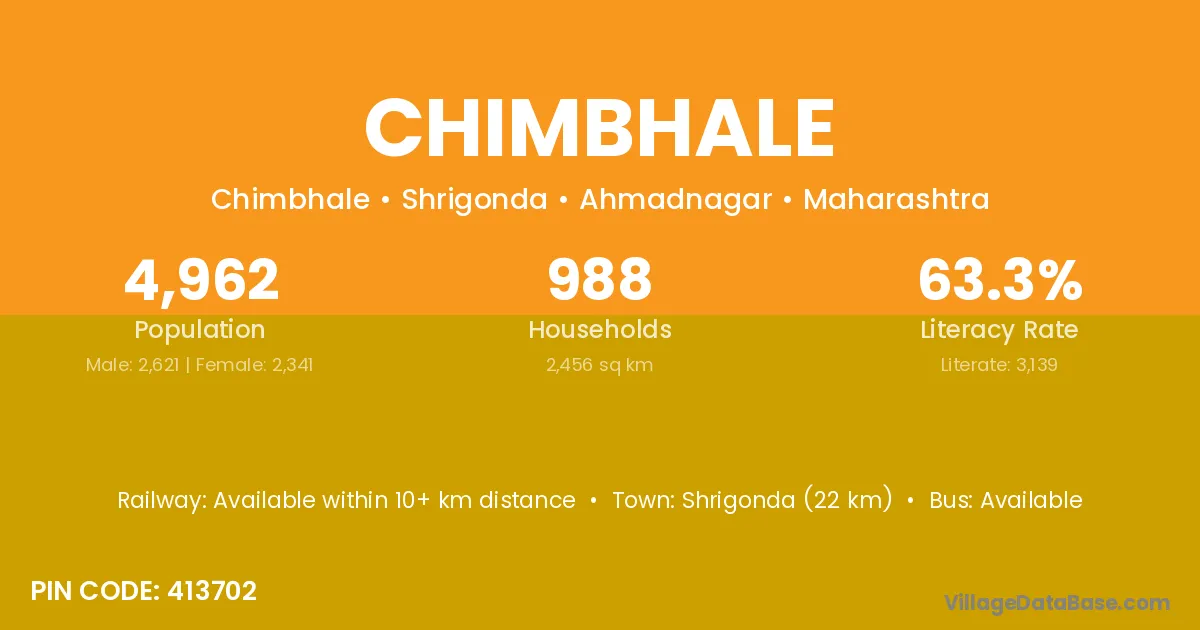 Shrigonda (22 km) is the nearest town to Chimbhale village for major economic activities and is located approximately 22 km away.