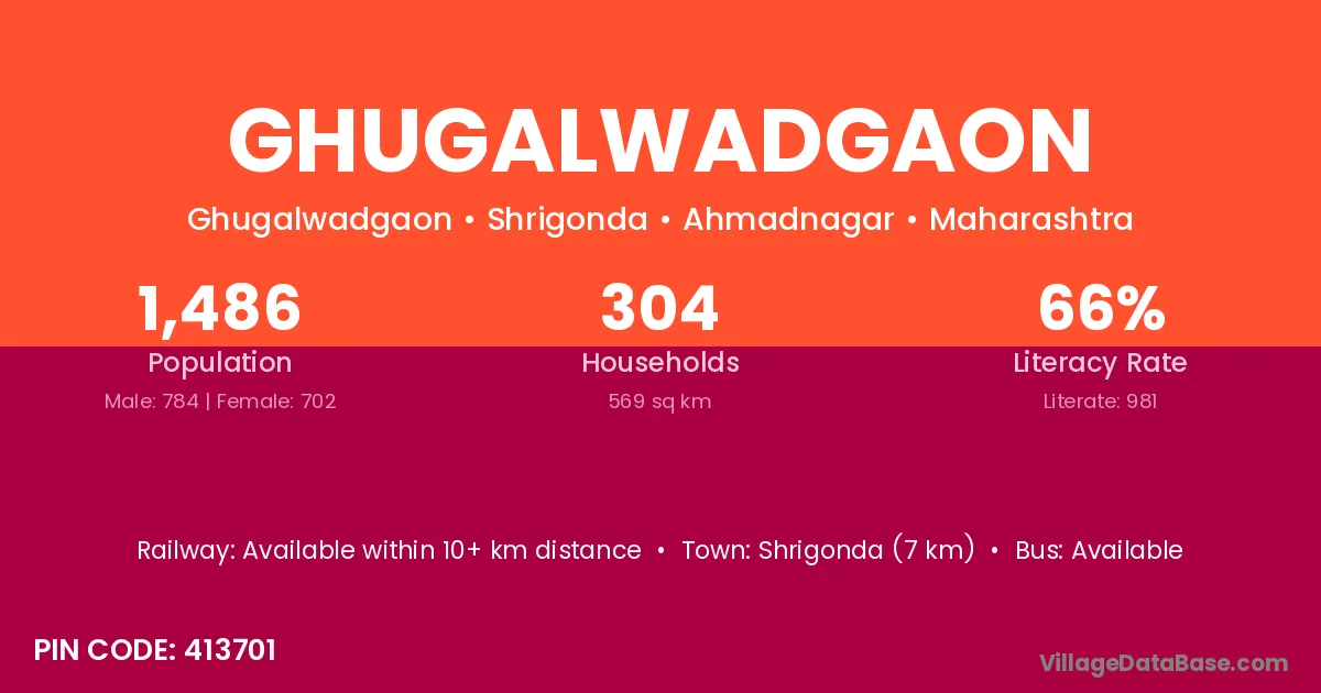 Shrigonda (7 km) is the nearest town to Ghugalwadgaon village for major economic activities and is located approximately 7 km away.