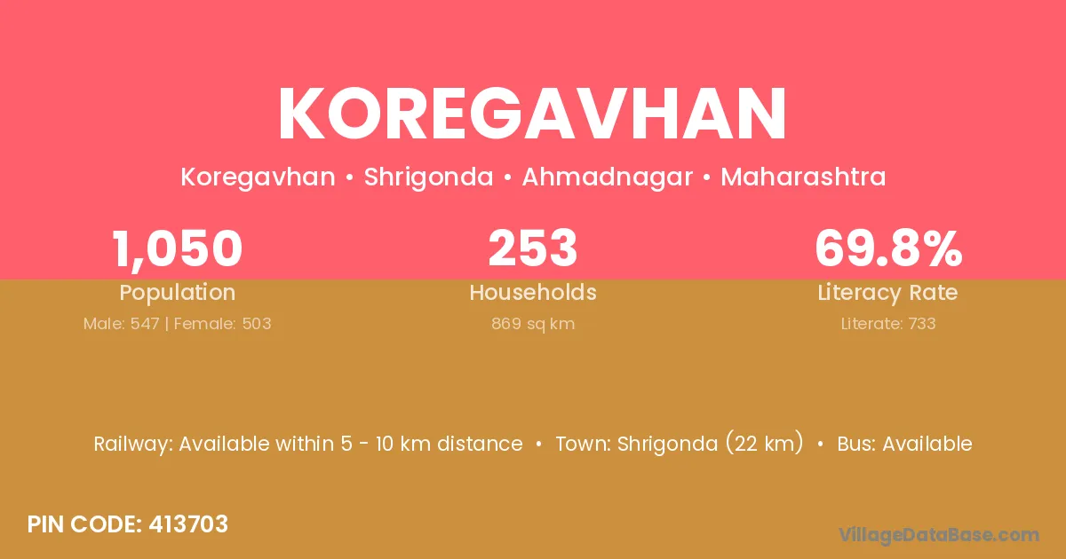 Shrigonda (22 km) is the nearest town to Koregavhan village for major economic activities and is located approximately 22 km away.