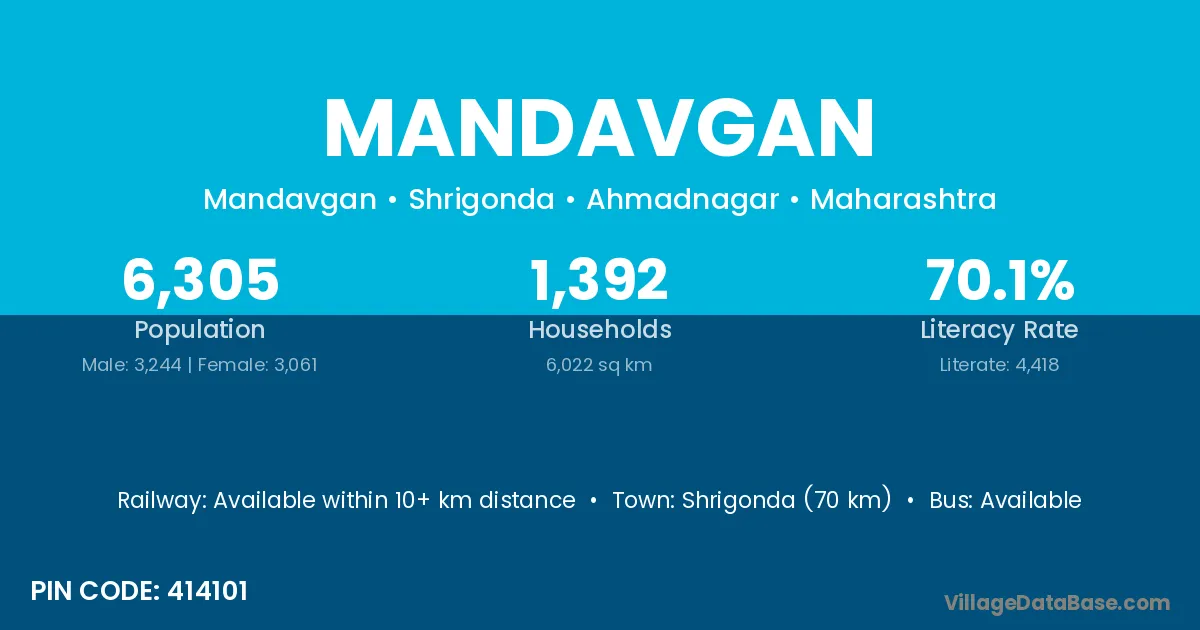 Shrigonda (70 km) is the nearest town to Mandavgan village for major economic activities and is located approximately 70 km away.