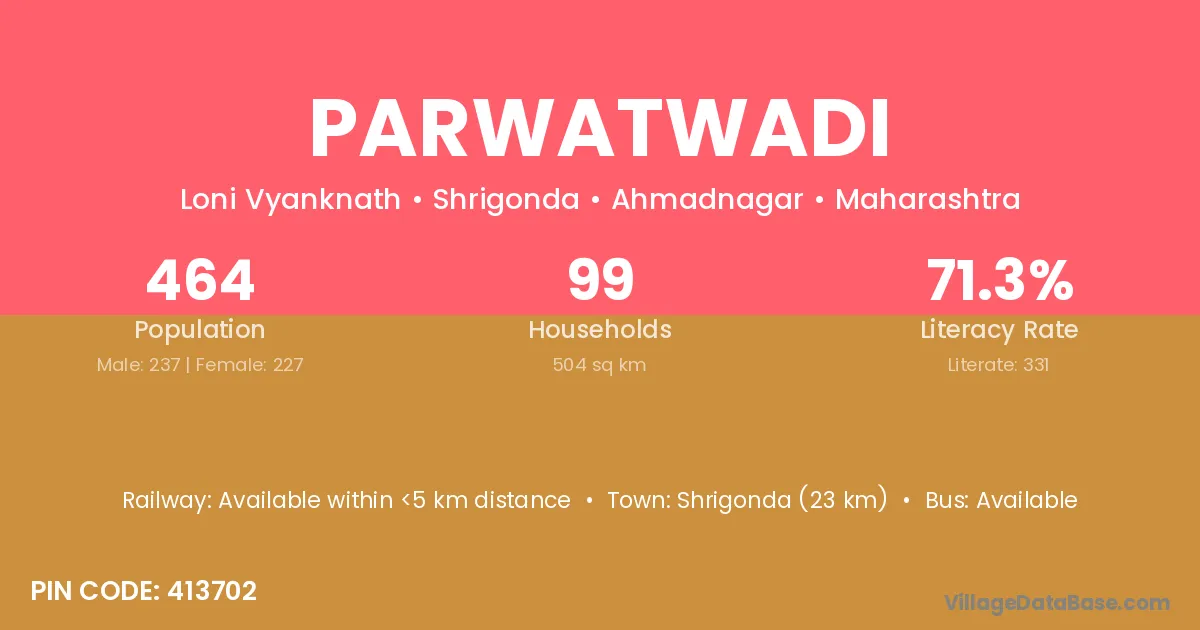 Parwatwadi village has a total population of 464 people, of which 237 are males and 227 are females.