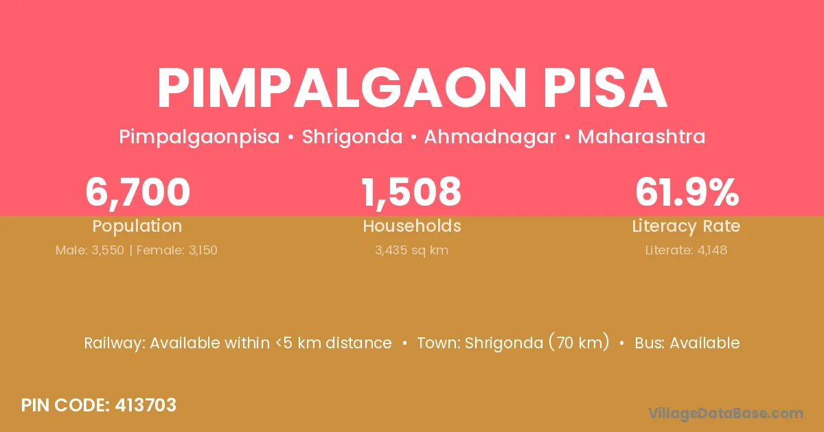According to Census 2011 information, the village code of Pimpalgaon Pisa village is 413703.