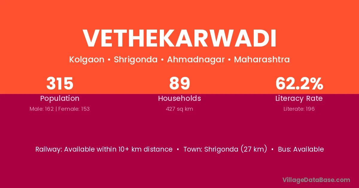 Vethekarwadi village has a total population of 315 people, of which 162 are males and 153 are females.
