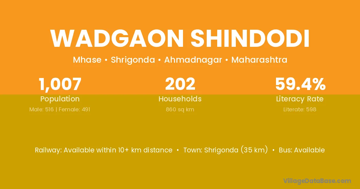 Wadgaon Shindodi village has a total population of 1,007 people, of which 516 are males and 491 are females.