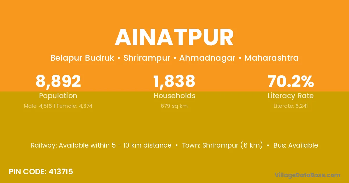 Shrirampur (6 km) is the nearest town to Ainatpur village for major economic activities and is located approximately 6 km away.