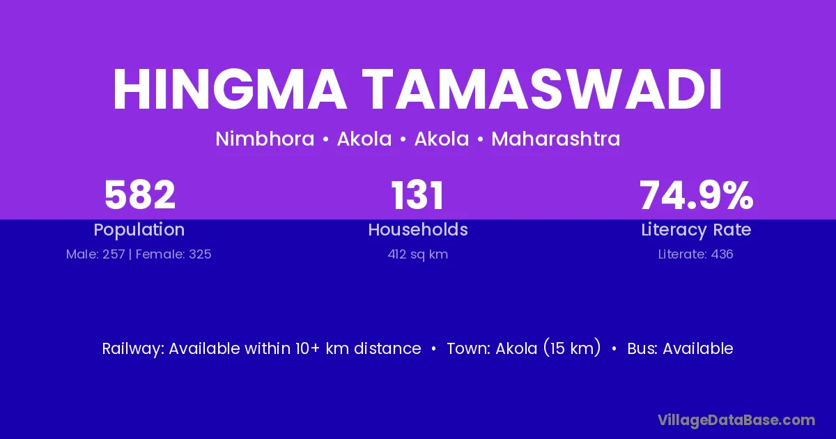 Akola (15 km) is the nearest town to Hingma Tamaswadi village for major economic activities and is located approximately 15 km away.