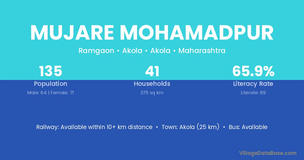 Akola (25 km) is the nearest town to Mujare Mohamadpur village for major economic activities and is located approximately 25 km away.