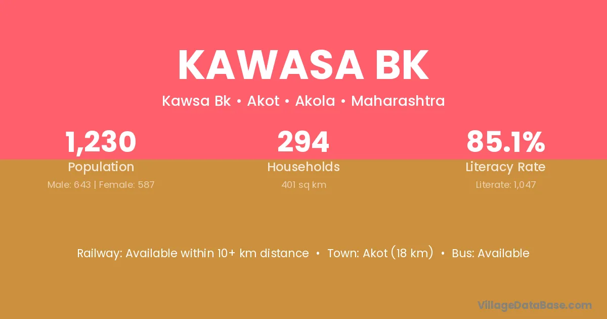 Akot (18 km) is the nearest town to Kawasa Bk village for major economic activities and is located approximately 18 km away.