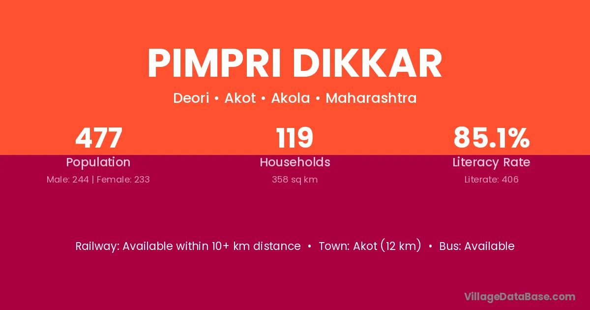 Pimpri Dikkar village has a total population of 477 people, of which 244 are males and 233 are females.