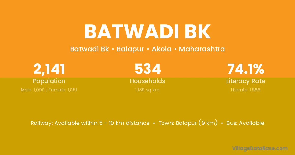 Balapur (9 km) is the nearest town to Batwadi Bk village for major economic activities and is located approximately 9 km away.