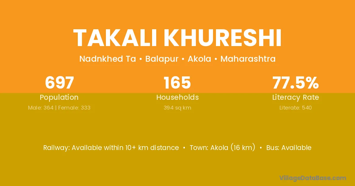 Akola (16 km) is the nearest town to Takali Khureshi village for major economic activities and is located approximately 16 km away.