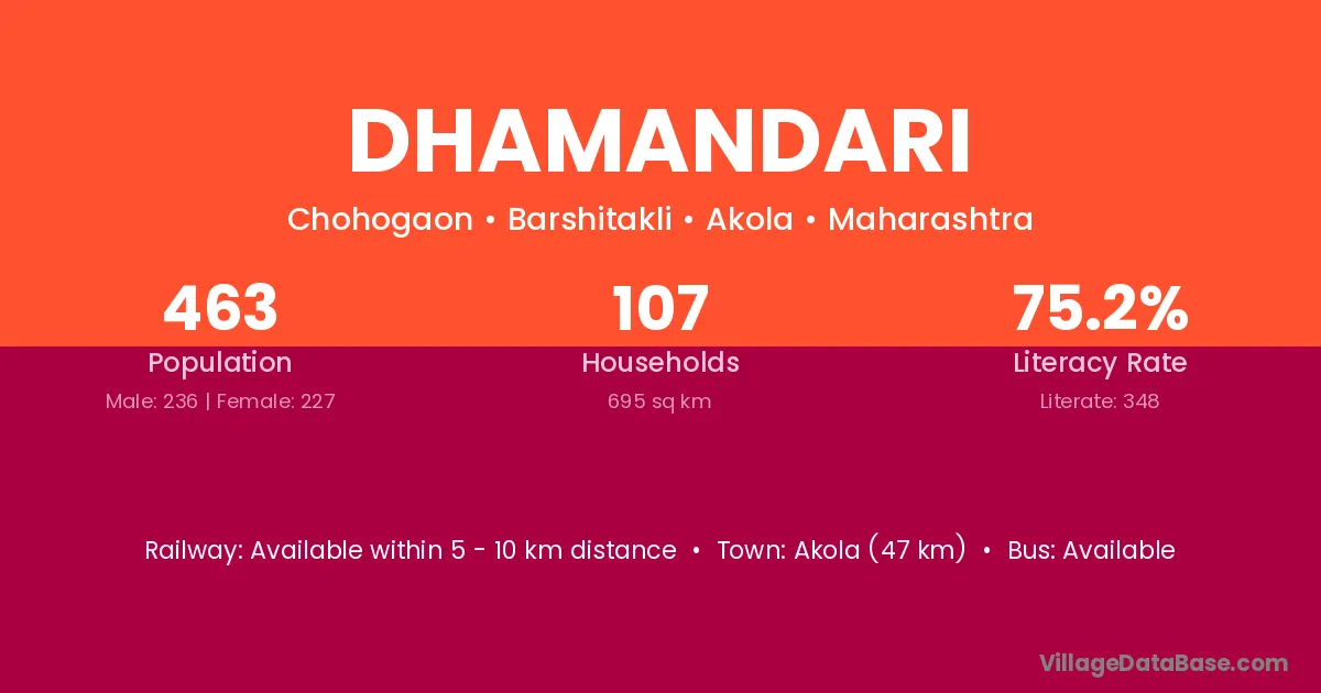 Akola (47 km) is the nearest town to Dhamandari village for major economic activities and is located approximately 47 km away.