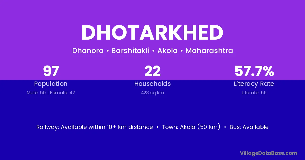 Akola (50 km) is the nearest town to Dhotarkhed village for major economic activities and is located approximately 50 km away.
